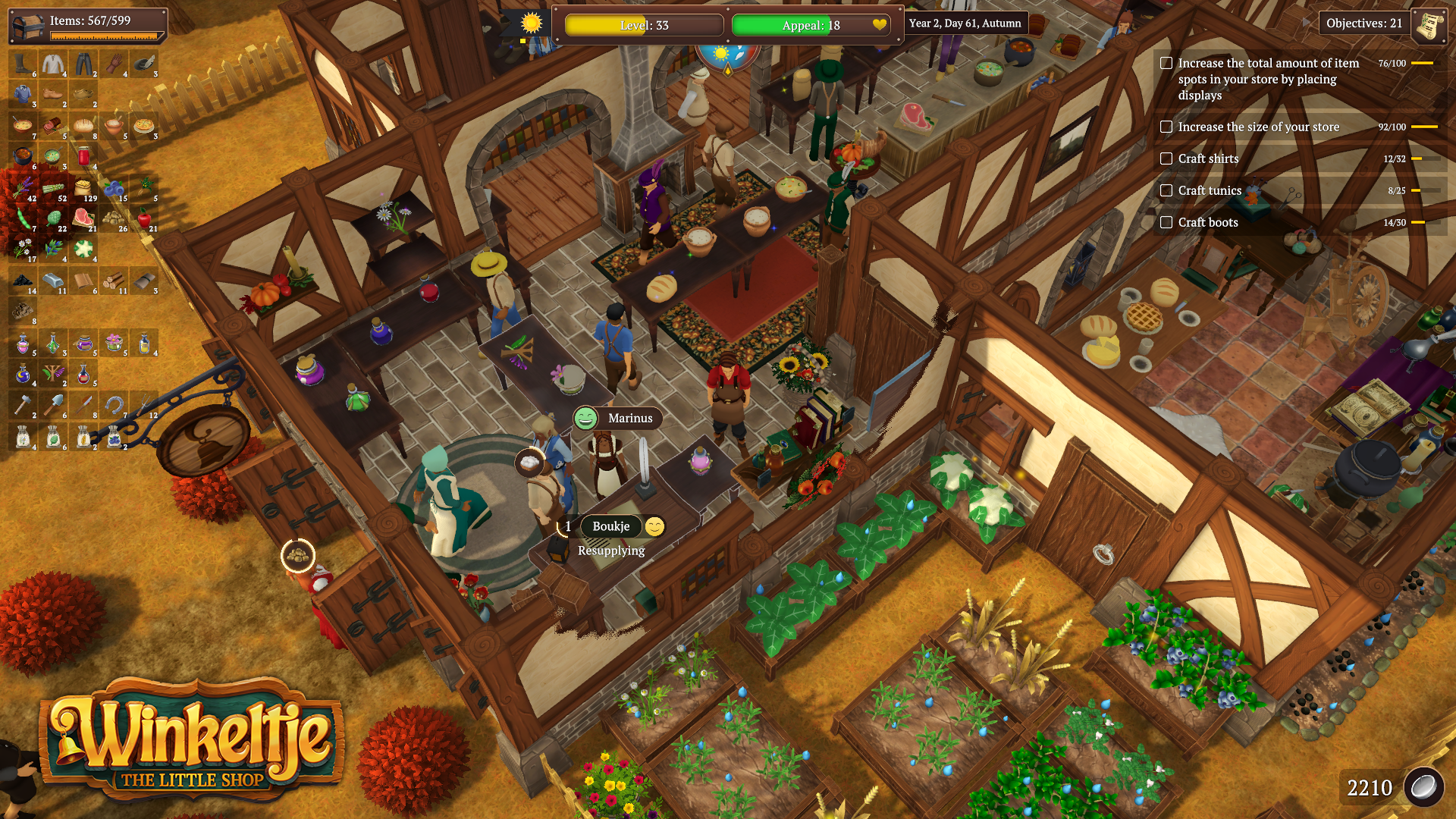 When you reach the limits you can use the shop builder tool to expand. Choose what floors, walls, windows, and doors you like in your shop. During the day-to-day business, you will encounter events and season changes that will affect the supply, demand, and more! What kind of shop will you make? Play Winkeltje and find out!